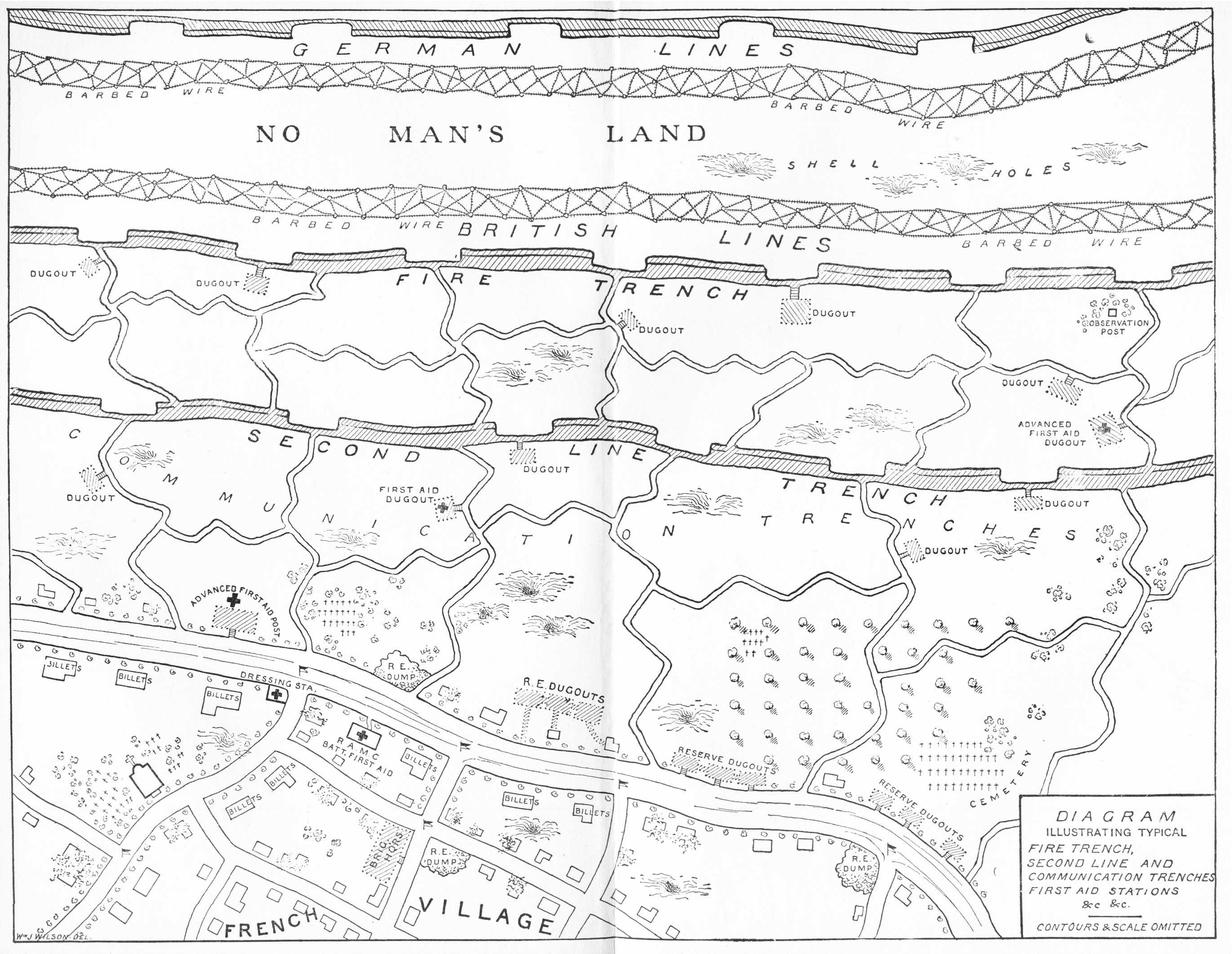 This training consisted of the rudiments of trench warfare. Trenches had been dug, with barbed-wire entanglements, bombing saps, dug-outs, observation posts, and machine-gun emplacements. We were given a smattering of trench cooking, sanitation, bomb throwing, reconnoitering, listening posts, constructing and repairing barbed wire, "carrying in" parties, methods used in attack and defense, wiring parties, mass formation, and the procedure for poison-gas attacks.