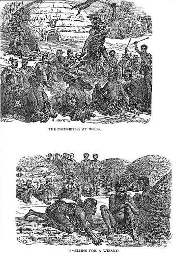 25 This custom is that of churning medicine in a pot of water. Two medicines are chosen; one represents the chief, the other the enemy. These medicines are placed is separate vessels; if that representing the enemy froths up suddenly, whilst that representing the chief does not froth, they regard it as a sign that the enemy will prove too strong for them if they attack him at that time, and the army is not allowed to go out to battle. The same trial is repeated again and again, it may be for months or even years, and the army is allowed to go out to battle only when the sign is reversed, and the chief's vessel froths up, and that of the enemy does not froth.