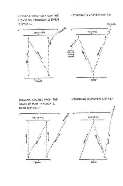 (except in very rare cases) as an advance in straight lines, but as an advance by undulations,--a psychical rhythm of motion. This is exemplified by the curious Buddhist classification of the different short courses by which the Kwan or revenants may hope to reach Nirvana. These short courses are divided into Even and Uneven;--the former includes an equal number of heavenly and of earthly rebirths; while in the latter class the heavenly and the earthly intermediate rebirths are not equal in number. There are four kinds of these intermediate stages. A Japanese friend has drawn for me the accompanying diagrams, which explain the subject clearly.