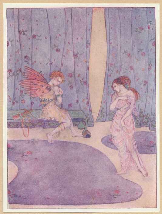 When night came, Venus returned home from the banquet well tippled with wine, smelling of balm, and crowned with garlands of roses, who when she espied what Psyche had done, gan say: "This is not the labour of thy hands, but rather of his that is amorous of thee." Then she gave her a morsel of brown bread, and went to sleep.