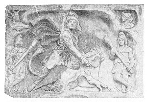 In the possession of Mr. S. H. Janes, Janes Buildings, Toronto, Canada. With the usual accessories. In the upper left-hand corner a bust of the Sun, and in the upper right-hand corner a bust of the Moon. The left hand of the god, which has been broken off, apparently grasps a horn and not the nostrils of the bull. In all probability partly restored, it being scarcely possible that the dadophori could both have held upright torches. (T. et M., Fig. 418, p. 483.)