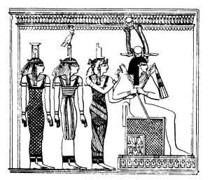 Osiris seated in his shrine at Abydos. Behind him stand the goddesses Isis, Amentet, and Hathor.