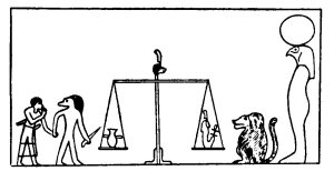 The weighing of the heart in the presence of Râ. Thoth appears in the form of an ape, and Anubis in the form of a being with an animal's head, who drags the deceased to the Balance and holds a knife in his hand.