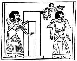 the body; the picture of the deceased walking away from a "block of slaughter" and a knife dripping with blood suggests escape from a cruel death; the picture of a soul and spirit standing before an open door suggests that the soul has freedom to wander about at will; and the picture of the soul and the shadow in the act of passing out through the door of the tomb indicates clearly that these parts of man's economy are