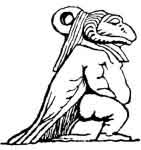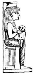 agreeing with that afterwards adopted by the Christians--namely, the Great God, the Son God, and the Spirit God. In Fig. 88, the ugly grotesque human body is that of the great Pthah, the hawk's wings are those of the child Horus, and the ram's head is that of Kneph, the Spirit. But the favourite character of Horus is that of the Son. Instead of being a crowned king, the avenger of his Fig. 88. father, he becomes a young man, or rather a child, with a finger on his mouth, as if he had not yet learned to talk, as in Fig. 89. He is sometimes seated, as a baby, within the leaves of a lotus flower representing the rising sun; and even while a baby, holds the sceptres of Osiris as judge of the (lead. Among the porcelain images, made to be worn as charms, and to be tied round the neck with a string, he is often a child in his mother's arms (see Fig. 90).