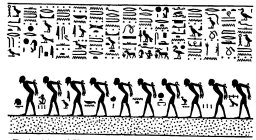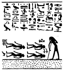 On the left side of the boat of Ra are: 1. The god TEM, who is depicted in the form of an aged man, leaning heavily on a stick which he grasps in his right hand. 2. Four male beings who are lying prostrate on their backs. 3. Twenty male beings, with their backs bowed, and their arms tied together at their elbows behind their backs. The our beings are described as "the inert," and the twenty as "the apostates of the Hall of Ra, who have blasphemed Ra upon earth, who have invoked evils upon him that is in the Egg, who have thrust aside the right, and have spoken words against KHUTI."