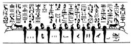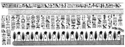 shoulders of eight gods, in mummied form, who are called "Bearers of the gods," at each end, immediately behind the bull's head, stands a bull, and at intervals seven gods, who are called "the