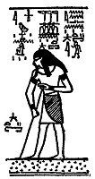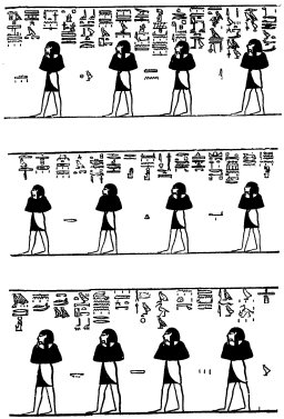 3. An upright, bearded mummied form called QAN. To the neck of this figure are attached two ropes, which are twisted together symmetrically, and are grasped by twelve bearded men with both hands. Each god stands within a loop formed by the two ropes, and has a star before him. The gods are described as "those who hold the rope which cometh forth . . . . . . . ."