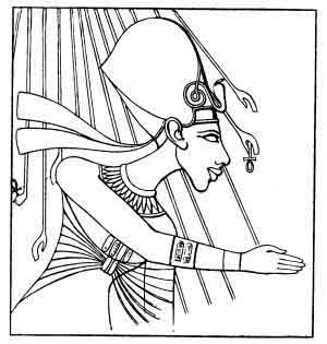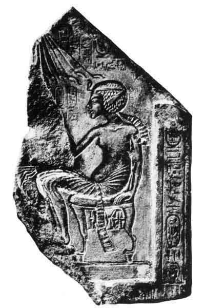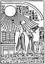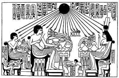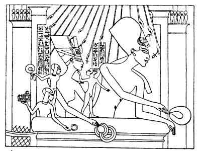 Amenhetep IV seated on his portable lion-throne beneath the rays of Aten; he holds in his hands the old Pharaonic symbols of sovereignty