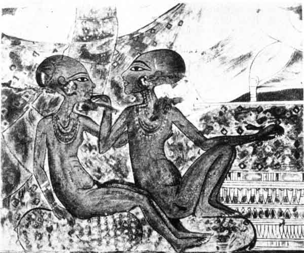 [paragraph continues] Egyptian, being of African origin, never understood or cared for philosophical abstractions. Another question arises: did the Atenites mummify their dead? It is clear from the existence of the tombs in the hills about Aakhunaten that important officials were buried; but what became of the bodies of the working class folk and the poor? Were they thrown to the jackals "in the bush"? All this suggests that the Atenites adored and enjoyed the heat and light which their god poured upon them, and that they sang and danced and praised his beneficence, and lived wholly in the present. And they worshipped the triad of life, beauty and colour. They abolished the conventionality and rigidity in Egyptian painting and sculptures and introduced new colours into their designs and crafts, and, freed from the control of the priesthoods, artists and workmen produced extraordinarily beautiful results. The love of art went hand in hand with their religion and was an integral part of it. We may trace its influence in the funerary objects, even of those who believed in Osiris and were buried with the ancient rites and ceremonies especially in figures, vases, etc., made of pottery. Perhaps the brightly coloured vignettes, which are found in the great rolls of the Book of the Dead that were produced at this period, were painted by artists who copied the work of Atenite masters.