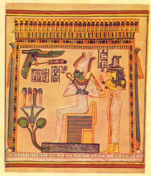 OSIRIS KHENTI AMENTI, the Great God, seated in his shrine of fire. In front of Osiris is the Eye of Horus and behind him stand the Godesses ISIS and NEPHTHYS.
