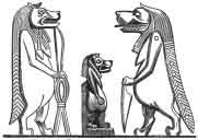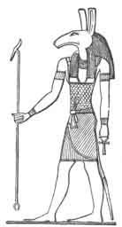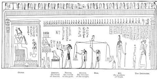 Then the departed one places his heart on the balance of truth, where it is weighed by the hawk-headed Hor and the jackal-headed Anubis, "the director of the weight," the weight being shaped in the figure of the goddess of truth. Thoth, the ibis-headed scribe of the gods, reads Hor's report to Osiris, and if it announces that the weight of the heart is equal to truth, Thoth orders it to be placed back into the breast of the departed