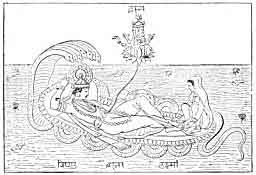 [Vishnu reclines on a flower, supported by the serpent Ananta (a symbol of eternity), floating on the primeval waters of the undifferentiated world-substance.] After a native illustration, reproduced from Hermann Göll.