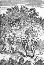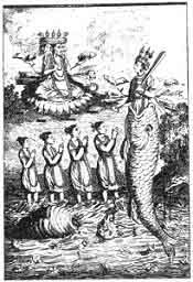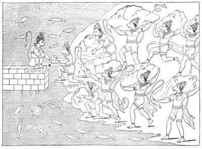 HANUMAN, THE MONKEY KING, BUILDING THE BRIDGE OVER THE STRAIT BETWEEN INDIA AND LANKA. (Reproduced from Hermann Göll.)
