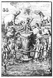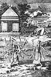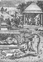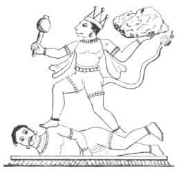 Pralada's grandson, Balis, was a pious king, but on that very account dangerous to the gods, for he was just about to complete the hundredth grand sacrifice, by which he would have acquired sufficient power to dethrone Indra. Vishnu came to the assistance of the god of heaven and appeared before Balis as a dwarf in guise of a Brahman mendicant. Balis honored him with presents and promised to fulfil his desire, whereupon the dwarf requested three paces of ground. This was gladly granted under a rigid oath that would be binding on gods and men. Then the dwarf assumed a huge shape and stepped with the first pace over the whole earth, with