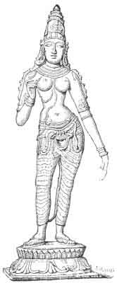 murder in any form, trampling under foot even her own husband. There is scarcely a village without a temple devoted to her, and her images can be seen in thousands of forms. Her appearance is pleasant only as Pavarti; in