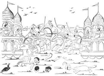 the Iliad of the Hindus, which describes the war between the Kurus and the Pandus, 1 both descendants of Bharata and both grandchildren of Vyasa. Dhritarashtra, the father of the Kurus, was king of Hastinapur, but being blind, Bhishma, his uncle, reigned in his stead. After a test of the faculties of the young princes, in which the Pandu Arjuna, the skilled bowman and the Hindu Tell, showed himself superior to all the others, the oldest Pandu-prince, Yudhishthira, was installed as heir apparent. The Kurus, however, who managed to remain in power, tried to burn the Pandus, but they escaped and lived for some time in the disguise of mendicant Brahmans. Having allied themselves, by marriage with Draupadi, 2 the daughter of Drupada, king of Panchala, with a powerful monarch, the Pandus reappeared at Hastinapur and induced Dhritarashtra to divide the kingdom between his sons, the Kurus, and his nephews, the Pandus; but at a festival, held at Hastinapur, Yudhishthira, the chief