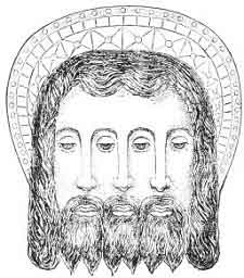 of God as possessed of three faces. The most striking among these productions is an old oil painting which was discovered by a German artist at Salerno and published for the first time in Die Gartenlaube (1882, No. 47). The four eyes in their meditative attitude make a weird impression on the spectator, the three elongated noses show a freedom from sensuality, the brown hair and beard indicate strength, the broad forehead wisdom.