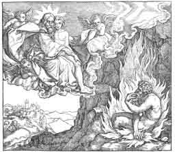 white robes, the sun becomes black as sackcloth, and the moon becomes as blood. Then an angel pronounces a triple woe upon the inhabitants of the earth. The pit is opened and four angels who had been bound are loosed to slay the third part of men. A struggle ensues between a women that travaileth and the dragon, but the dragon is cast down. A beast with seven heads and ten horns appears; another beast follows and makes an image of the first beast that should be worshipped by men. "The number of the beast" is "six hundred and three score and six," which according to cabalistic symbolism means "Nero." The Roman Emperor is thus regarded as an incarnation of Satan, and for a short time power is given to the pagan government over the world. But the victorious Lamb stands on Mount Zion; the Gospel is preached, and the sickle of the harvest is ready for gathering in the clusters of the vine. Then the seven vials of wrath are poured out upon mankind. The city "which reigneth over the kings of the earth" (i. e., Rome), the old Babylon, the mother of abominations, shall fall, and the fowls of the air are called to fill themselves with the flesh of the slain. Satan is bound for a thousand years, but let loose again. In a final struggle, Gog and Magog are conquered, whereupon a new heaven and a new earth are created. A heavenly Jerusalem descends upon earth and the twelve tribes inhabit the city, which needs no sun because God is its light. The pagan Christians remain outside: "The nations of them which are saved shall walk in the light of it, and the kings of the earth bring their glory and honor into it."
