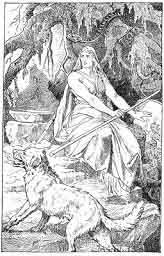 Loki induced the gods to build fortifications, for which the architect, who was one of the giants and an enemy of the gods, should, if he finished his work in a stipulated time, receive as remuneration Freyja, the goddess of beauty and love. But when it became apparent that the walls would be soon completed, Loki, true to his treacherous character, assisted the gods in cheating the architect. He further helped the giant Thjasse to steal Idun with her immortality-giving golden apples. Only when the gods threatened to punish him did he become accessory in bringing Idun back again. The worst deed which Loki accomplished was the death of Baldur, the god of light and purity. After that he was outlawed and resided no longer in Asgard. But he came back and mocked the gods when they were assembled at Ægir's banquet. At last he was captured and in punishment for his crimes tied upon three pointed rocks right beneath the mouth of a serpent. Sigyn, Loki's wife, remains with him to catch the dripping venom in a bowl, which from time to time she empties. Whenever the bowl is withdrawn the venom drops into Loki's face
