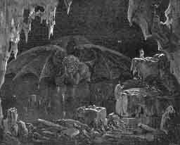 in Ireland, and of the vision of hell as described by Beda, Albericus, and Chevalier Tundalus. In the last song of the Inferno, Dante describes the residence of the sovereign of hell, which is surrounded by a thick fog, so as to make it necessary for the poet to be led by the hand of his guide. There the ice-palace stands almost inaccessible through the cold blizzards that blow about it; and