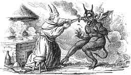 engaged in the fabrication of a Eucharist cup, the Devil suddenly appeared to him. But the saint was not afraid; he took the pincers out of the fire and seized the nose of Satan, who ran off with a howl and never again dared to molest him. The event is commemorated in an old rhyme, thus: