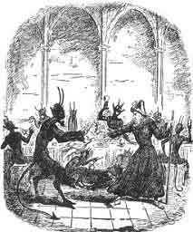 An act of bravery is told of St. Cuthbert. Sir Guy Le Scoope (as Thomas Ingoldsby tells us, closely following the chronicle of Bolton) expected company, but finding at the appointed hour the banquet hall empty, because the guests had been kept away through a bad joke of the inviting messenger, he called on the Devil and ten thousand fiends to eat the dinner and take all that was there with them to the infernal regions. The Devil came with his devilish company and all the folk of Sir Guy fled, leaving the little heir behind, who was at once seized by Black Jim, the leader of the fiendish company. In his anxiety Sir Guy cried to St. Cuthbert of Bolton, who actually made his appearance in the shape of ail old palmer and forced the demoniac crowd to surrender the child, but he generously allowed them to remain as the guests of Sir Guy, adding: