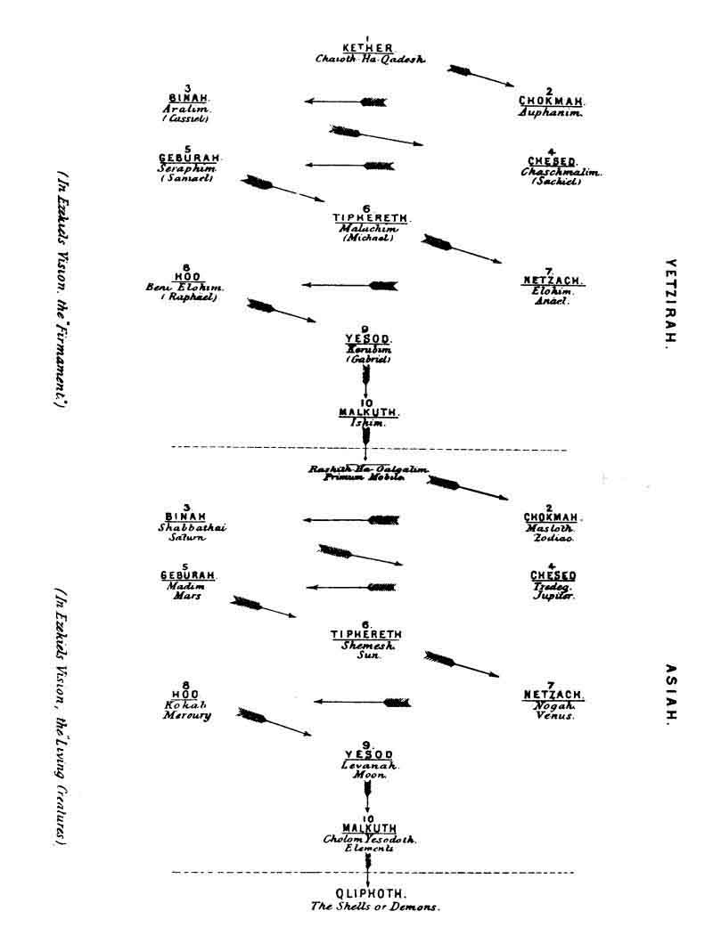 [The Tetragrammaton (see Introduction, § 67) comprehends the whole ten Sephiroth, and consequently expresses their three trinities of balanced force also; consequently, when the Tetragrammaton appears, the formless and the void and the darkness disappear, and form, fulness, and light replace them.]