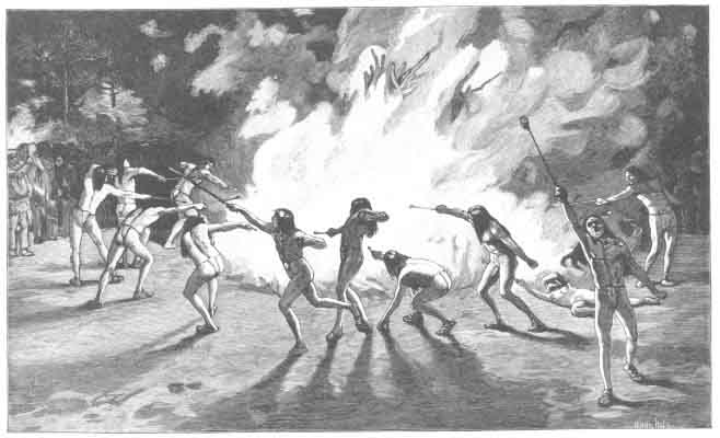 128. At 8 o'clock a band of musicians which I will call the orchestra entered, sat down beside one of the small fires in the west, and began to make various vocal and instrumental noises of a musical character, which continued with scarcely any interruption until the close of the dance in the morning. At the moment the music began the great central fire was lighted, and the conflagration spread so rapidly through the entire pile that in a few moments it was enveloped in great flames. A storm of sparks flew upward to the height of a hundred feet or more, and the descending ashes fell in the corral like a light shower of snow. The heat was soon so intense that in the remotest parts of the inclosure it was necessary for one to screen his face when he looked towards the fire. And now. all was ready to test the endurance of the dancers who must expose, or seem to expose (paragraph 149), their naked breasts to the torrid glow.