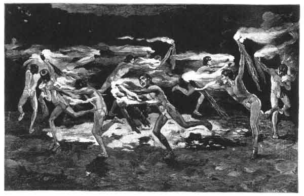 two extra bundles on his shoulders for the later use of the leader. The latter carried four small fagots of the same material in his hands. Four times they all danced around the fire, waving their bundles of bark towards it. They halted in the east; the leader advanced towards the central fire, lighted one of his fagots, and trumpeting loudly threw it to the east over the fence of the corral. He performed a similar act at the south, at the west, and at the north; but before the northern brand was thrown he lighted with it the bark bundles of his comrades. As each brand disappeared over the fence some of the spectators blew into their hands and made a motion as if tossing some substance after the departing flame. When the fascicles were all lighted the whole band began a wild race around the fire. At first they kept close together and spat upon one another some substance of supposed medicinal virtue. Soon they scattered and ran apparently without concert, the rapid racing causing the brands to throw out long brilliant streamers of flame over the hands and arms of the dancers. Then they proceeded to apply the brands to their own nude bodies and to the bodies of their comrades in front of them, no man ever once turning round; at times the dancer struck his victim vigorous blows with his flaming wand; again he seized the flame as if it were a sponge and, keeping close to the one pursued, rubbed the back of the latter for several moments, as if he were bathing him. In the mean time the sufferer would perhaps catch up with someone in front of him and in turn bathe him in flame. At times when a dancer found no one in front of him he proceeded to sponge his own back, and might keep this up while making two or three circuits around the fire or until he caught up with some one else. At each application of the blaze the loud trumpeting was heard, and it often seemed as if a great flock of cranes was winging its way overhead southward through the darkness. If a brand became extinguished it was lighted again in the central fire; but when it was so far consumed as to be no longer held conveniently in the hand, the dancer dropped it and rushed, trumpeting, out of the corral. Thus, one by one, they all departed. When they were gone many of the spectators came forward, picked up some of the fallen fragments of cedar bark, lighted them, and bathed their hands in the flames as a charm against the evil effects of fire.