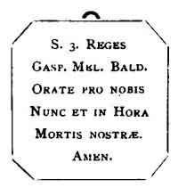 or halfpenny. are octagonal, and made of brass, and bear on one side the three kings worshipping the infant Jesus, and on the other the following inscription:--