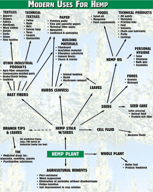 Hemp is a miracle crop, which withstands freezing temperatures, hot whether and is an excellent source of food. Help produces twice the yield of fabric per care as does cotton. The Declaration Of Independence was made out of hemp. So also was the first pair of blue jeans. It early colonial days of America citizens were required by law to grow hemp. Hemp is used to make logs for cabins. It also makes great rope. Hemp seeds are great bread.
