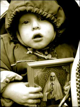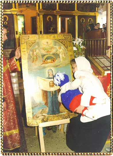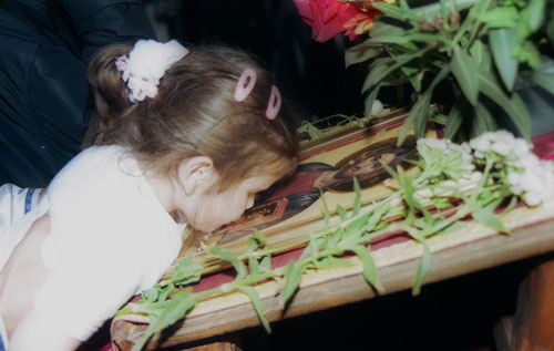 Little girl being forced to kiss an icon