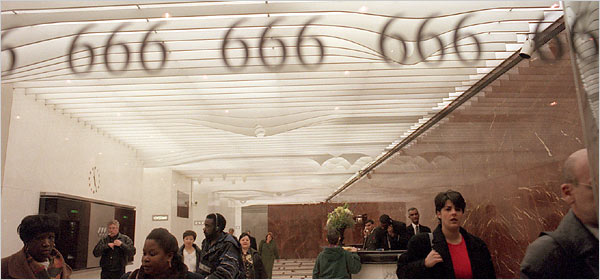 In the blockbuster Hollywood movie starring Arnold Schwarzenegger, TOTAL RECALL, there's a scene halfway through the movie showing an elevator on Mars with a big red flashing number. It flashes visually 3 times, the number... 6... 6... 6. Such numbers are cleverly hidden into dozens upon dozens of Hollywood movies.